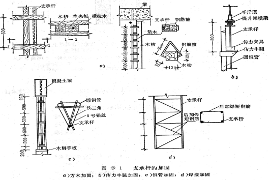 当采用空滑方法处理门窗洞口必须对支撑杆加固处理。一般采用方木加固、传力牛腿加固、钢管加固及加焊短钢筋加固(如图)